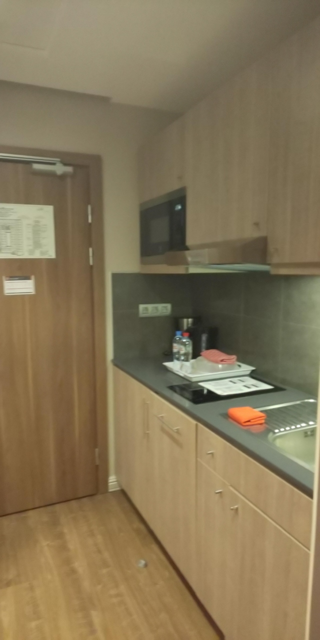 ツインルームの部屋に、二人で使うには十分な大きさのテーブルが置いてあり、独立したキッチン付き。