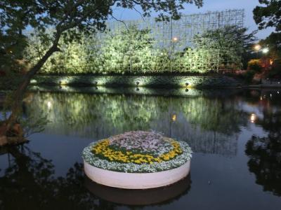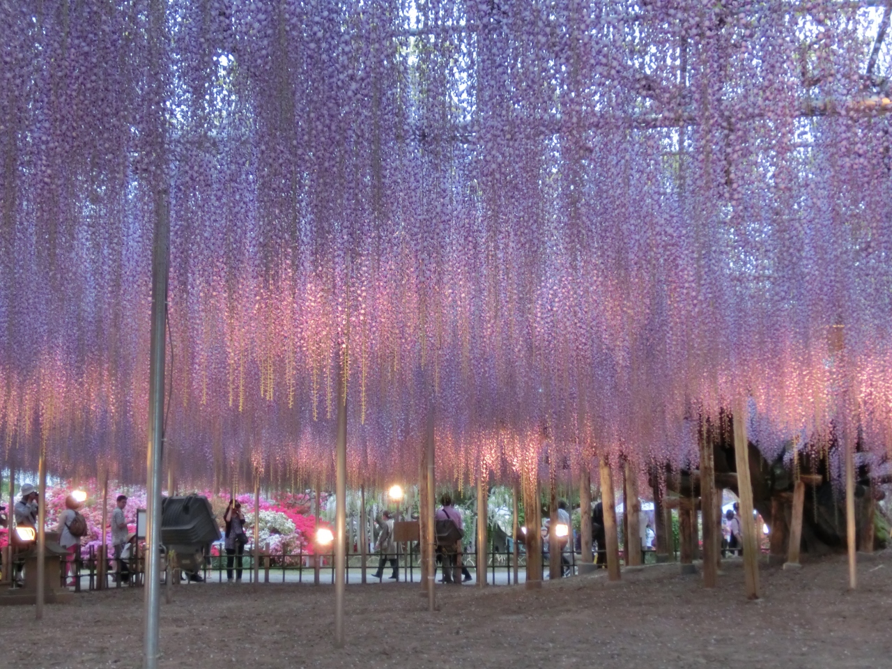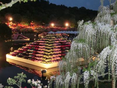 数年前の1度目は、藤が5分、つつじ等が7分咲き程度で物足りず、今回の2度目はほぼ満開に近い状態で大満足でした。ただ今回も黄色の藤が全く咲いてなく、少々残念でした(期待していた)。明るい時間帯の紫色、白色の大藤など素晴らしく、辺りが暗くなった時間帯、ライトアップ時は、明るいときとは違った趣きが感じられ、より一層の見応えでた。池の中央場所、座ってのライトアップ風景は、落ち着いて四方八方が見られ、本当に癒されると言っても過言ではないと思われます。