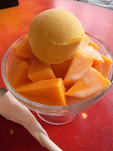 店内の可愛いフルーツ型のテーブルでイートイン、注文したのはもちろんマンゴーカキ氷とフルーツの盛り合わせ。