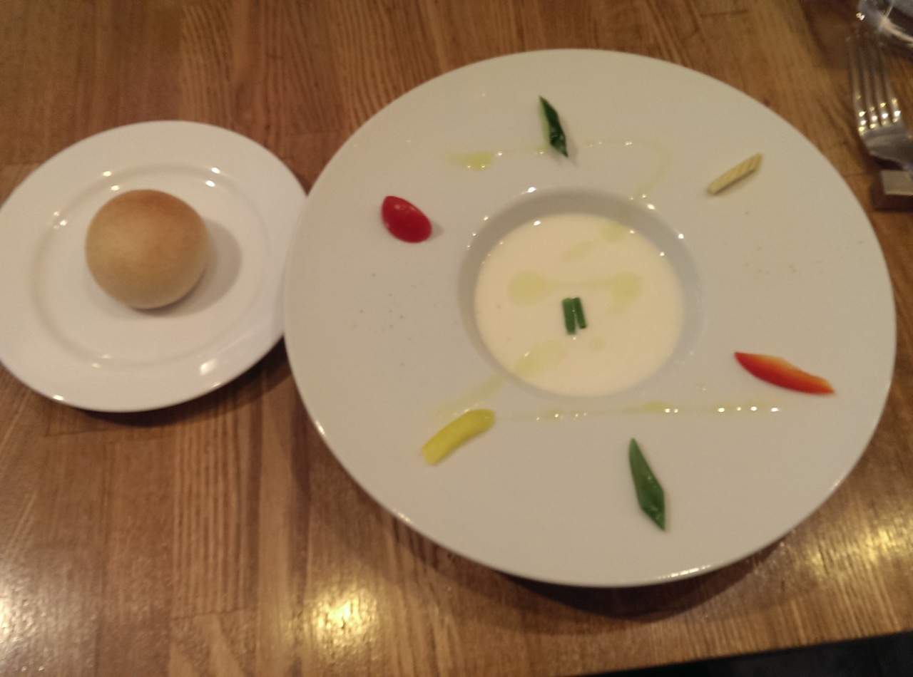 続いて見た目も美しい冷製のスープがきます、お皿の上に添えられた小さなお野菜がカワイイです。暑い日でしたので冷製スープは嬉しいです。