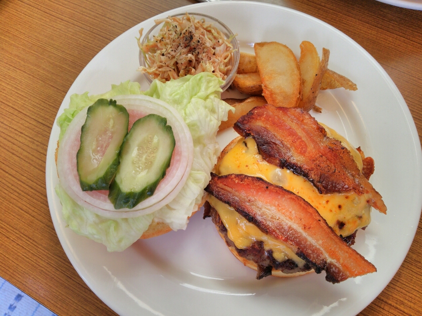 メニューはハンバーガーにサンドイッチ、肉や魚のメニューもあり悩みますが、いつもカリカリのベーコンが乗ったベーコンチーズバーガーをオーダーしゃちゃいます。