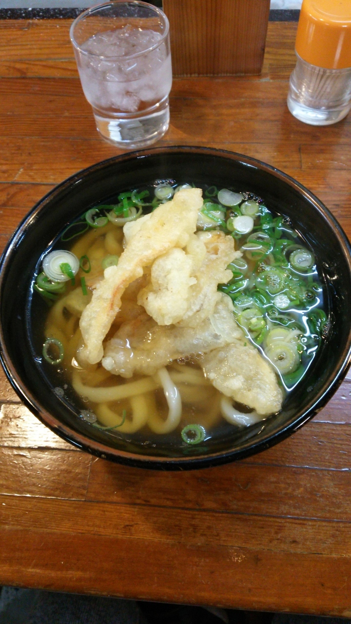 某博多出身の有名司会者さんのオススメのうどん屋さんだそうですが、JR博多駅の筑紫口より徒歩10分くらいで到着。1時過ぎでしたが10名ほどの行列ができています、がテーブル席も相席で詰めていき回転も良いのでそれほど待たずにカウンター席に座れました。お目当てのえびは入荷がなく今日はありませんとの事で、ごぼ天うどんにしました。