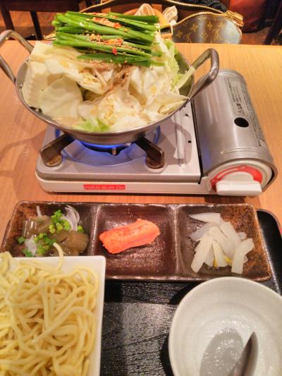 もつ鍋はオススメの味噌味にしました。一人鍋用にたっぷりのニラとキャベツが、モツも