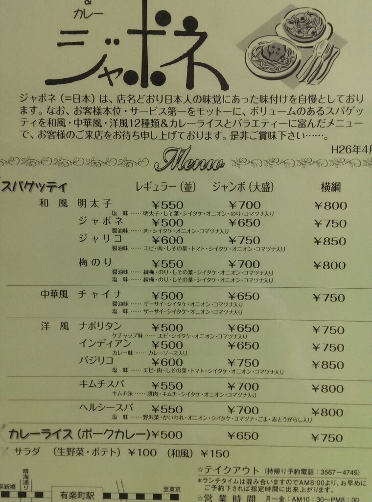 銀座インズ3内にある有名なスパゲッティー屋さんに初めて訪れた。店内は商業施設の一角に15席ほどのカウンター席。厨房の中には大量の茹で置き麺をさばく店員さん。メニューは店名にもあるジャポネを注文し、量は普通に。後ろに並んでる方がいてかき込むように食べました。男子率99%のお店でした。