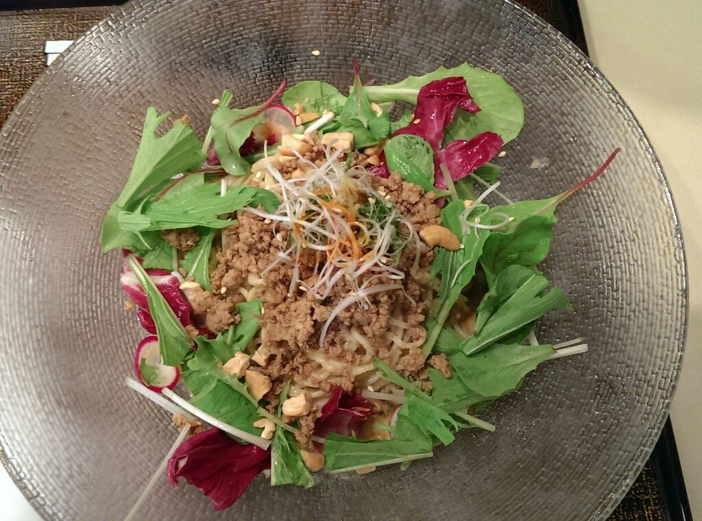 都庁での用事の帰りに雨が降っていたので、地下街から直結のこちらのお店を利用してみました。オーダーは梅おろしチキンカツでご飯を五穀米の少なめで、たっぷりの野菜の上にカットしてあるカツ、カツの上に大根おろしと梅ペーストが。