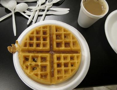 1) 無料の朝食: パン、パンケーキ、ヨーグルト、ジュース、コーヒーなど定番のものですが、食べに出る必要がないので 時間の節約になります。朝6時半からオープンしています。