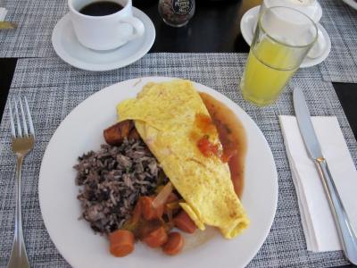 セルフサービスの朝食付きで、コスタリカの典型的な朝食が食べられます。コスタリカの国民食 ガジョ・ピント(炊いた長粒米と煮た豆を炒めたもの)、揚げた食用バナナ、煮たジャガイモなどを食べました。また、卵料理はその場で作ってくれます。