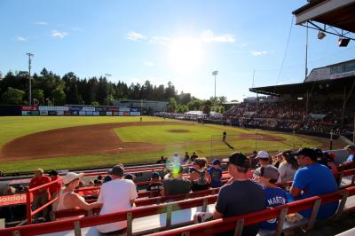 バンクーバー・カナディアンズのホーム球場、夕方の試合は1塁側~バックネット裏の座席が西日が当たらず お勧めです