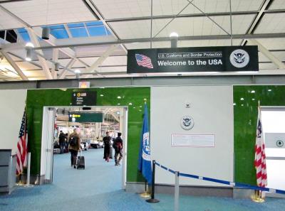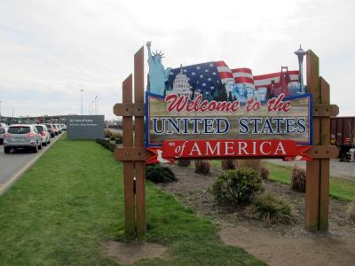 アメリカに出国する便は、搭乗前にアメリカ入国審査があります。アメリカに入ってから入国審査を受ける必要がないので、時間の節約になります。まだカナダなのに、「アメリカにようこそ (Welcome to USA)」 と書かれていて面白いです。カナダの出国審査はありません。