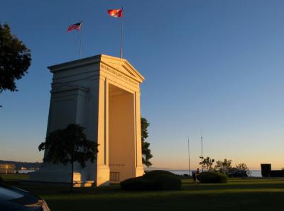 この公園はバンクーバーとシアトル間の国境として有名ですが、ちゃんと駐車場もあり 公園内で遊ぶこともできます。白いアーチ状の建物(ピースアーチ・モニュメント)がちょうど国境線上にあります。夏期は、国境を挟んで両側の花壇に 両国の国旗が描かれ、きれいです。公園内で遊ぶだけであれば、パスポートなしでもアメリカ側の公園に入ることができます。ただし、イミグレーションを通らずに相手側の公園の敷地外に出ることは禁止されています。