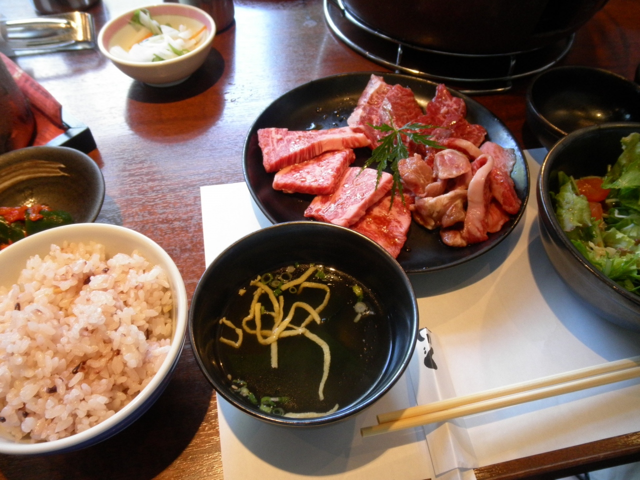 ランチ利用しました。私が頼んだのは「ミニ特選盛ランチ」。3種類のお肉と十二穀ご飯、サラダ、スープ、キムチのセットで¥980!「ミニ」とついているものの結構なボリュームでしかもおいしい!!お肉がとっても柔らかくてジューシーなんです。