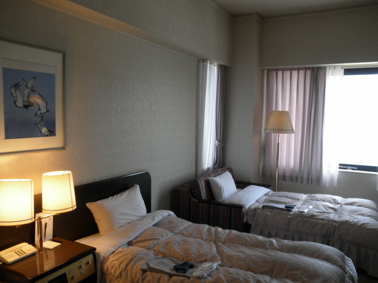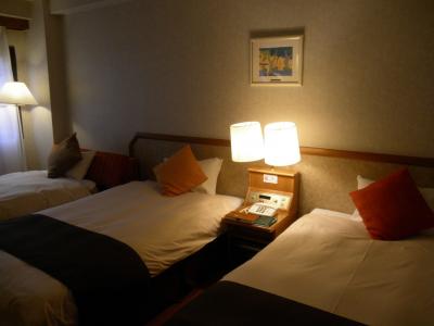客室はツインルームにソファーベッドを設置したもので、狭いですが、問題ありません。ただ、浴室はトイレと一緒のユニットで、アメニティも充実していませんので、ボディソープやシャンプー・リンスは持参をおススメします(歯ブラシ・据付のドライヤーはあります)。