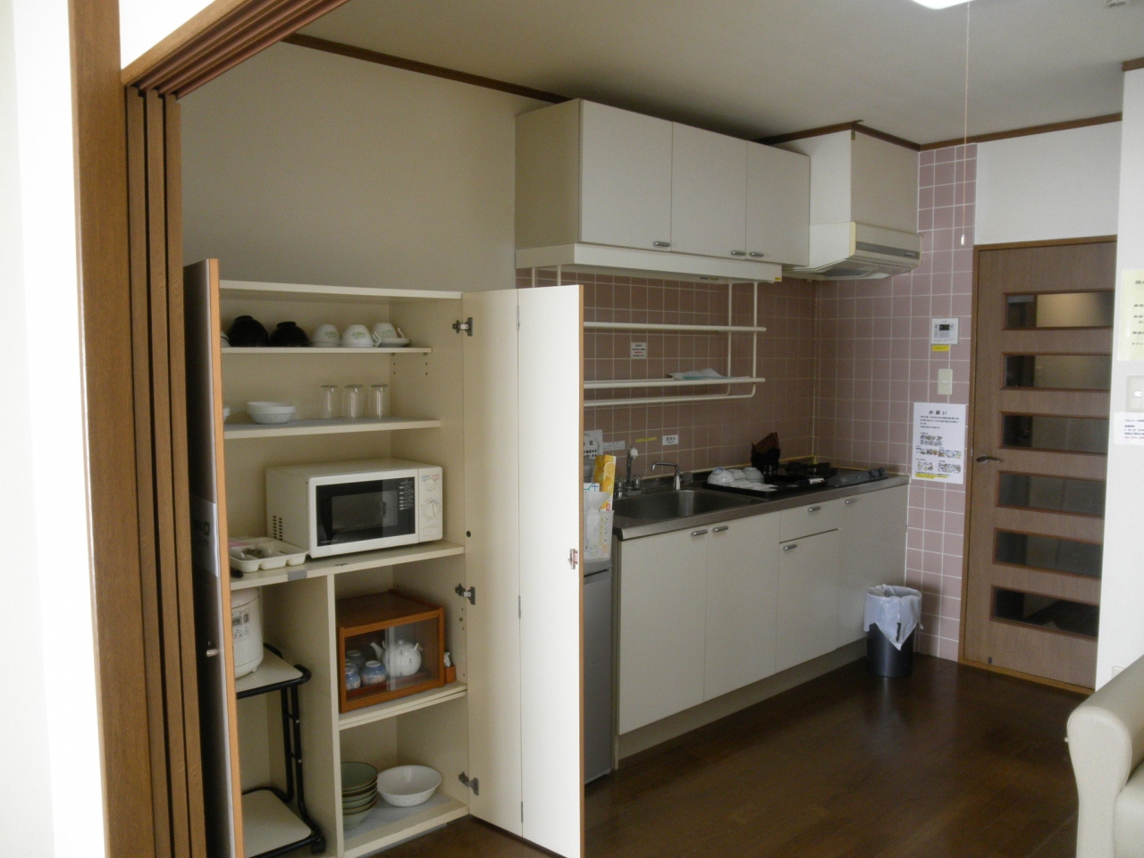 キッチンには冷蔵庫、ガス台、電子レンジ、電気ポット、鍋などの調理器具、食器、ラップ等が揃っています。ティーバッグのお茶が少しあったと思います。