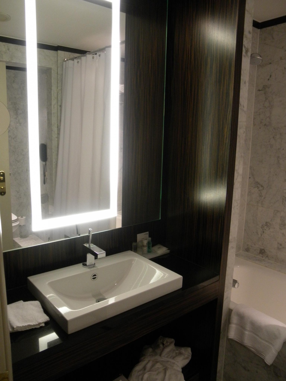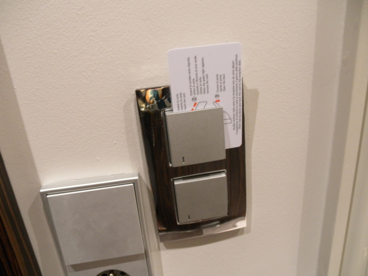 部屋に入って途方にくれたのが電気。カードキーを挿し込んでマスターの電源を入れるというのは察しがついたけど、どこに挿せばいいのか全くわからない!!夜なので部屋は暗く、ドアをスーツケースで押さえて半開きにしたまま15分くらい格闘し、やっとみつけました。こんなのは私だけかもしれませんが、参考の写真載せます。