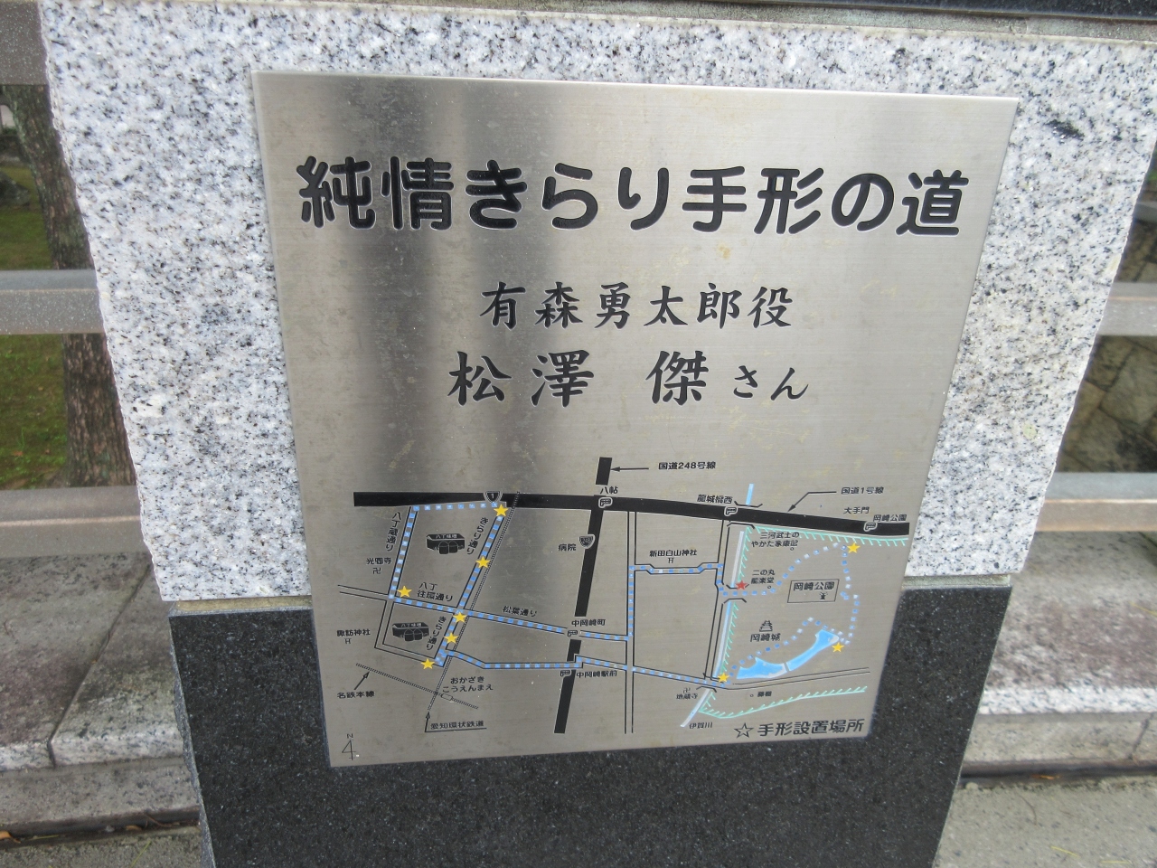 NHKの朝ドラだった純情きらりに出演されていた方の手形がはめ込まれた碑が、岡崎城周辺のの散策コースに点在しています。