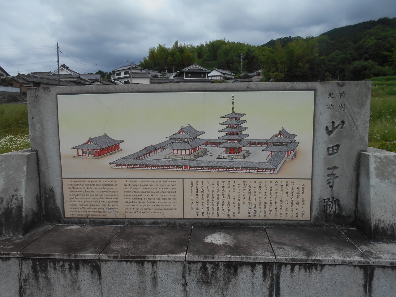 説明板にはかつての伽藍配置の様子が描かれていました。五重塔と講堂を囲むように回廊がめぐらされて門がおかれている配置は法隆寺などと共通するものがあるなあと思いました。- 旅行時期