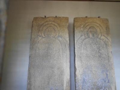 近代に造られたコンクリート製のお堂の中に、彫刻された仏様のお姿がある石板が2枚あります。風雨での劣化を防ぐためでしょうか。その分雰囲気には欠けますが、扉の格子が大きいので石仏自体はしっかり見ることができます。天平時代頃のものと推定されるそうですが、摩耗による損傷は少なくしっかり仏様とわかります。