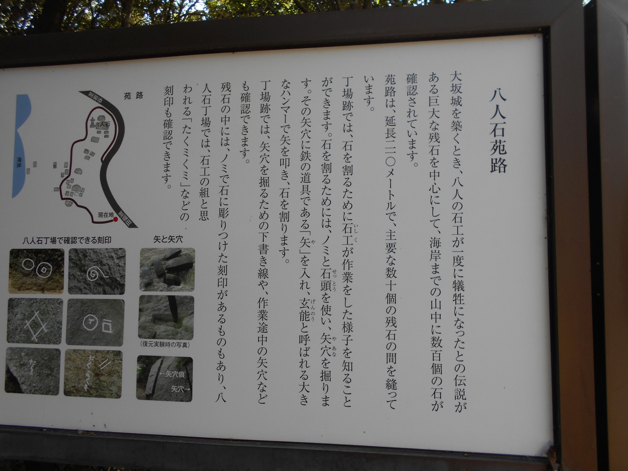小豆島には大阪城の石垣の石を切り出した場所がいくつかありますが、ここもそのひとつ。436号線を福田から草壁方面にむかっているとこの案内板があり国道を離れて散策路へと誘導されますが、八人石へはそのまま国道を歩き階段を降りた方が近いし歩きやすいです。