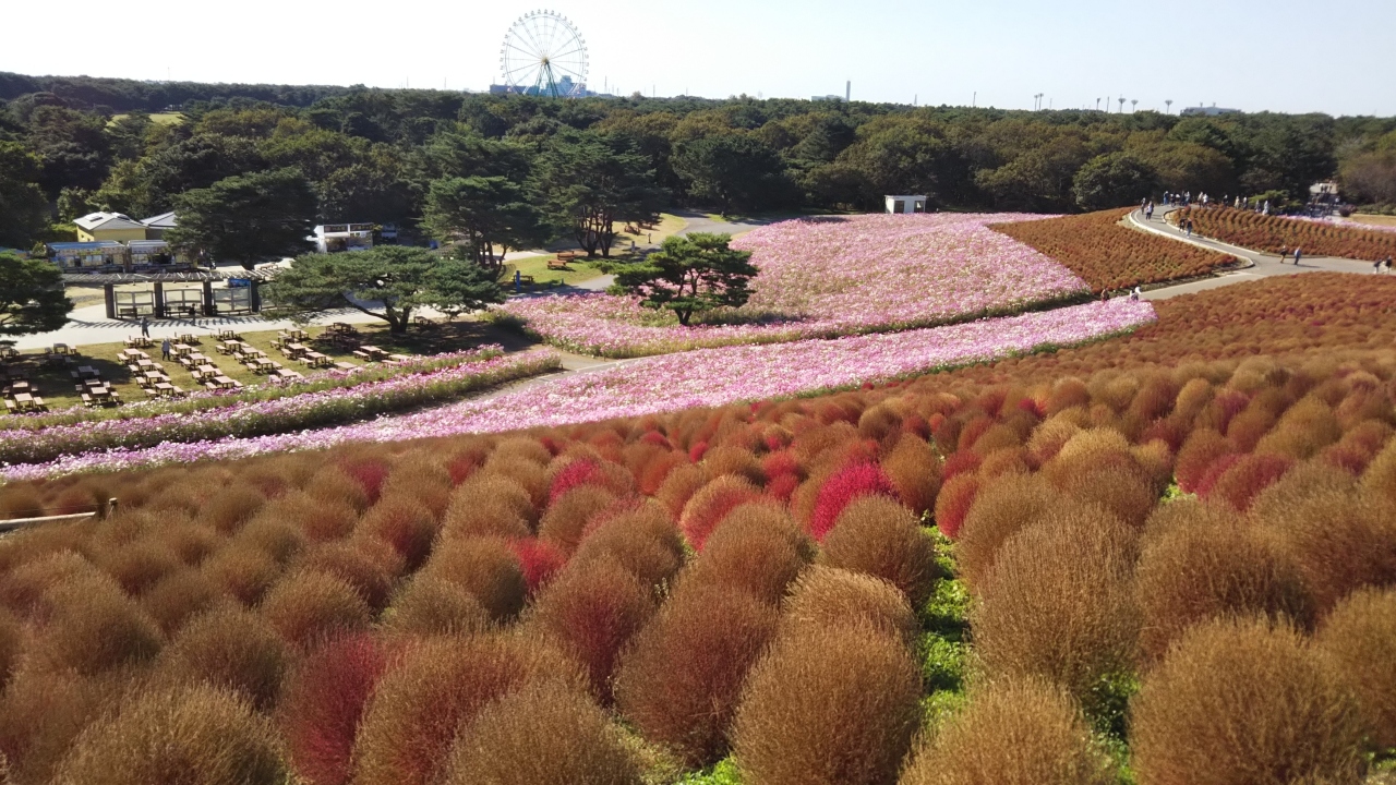 コキアの見頃は少し過ぎていましたが、コスモスが咲き乱れて、コキアとコスモスの共演が見事でした。ローズガーデンでは多種の薔薇が花をつけていました。色や形にバリエーションがあってこちらも見ごたえがありました。サイクリングコースや子供用の遊具も充実していて誰でもが楽しめます。