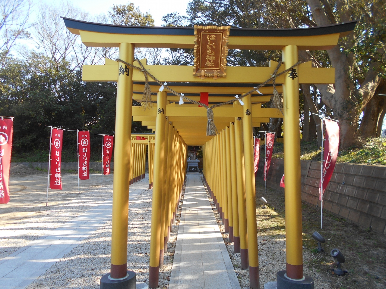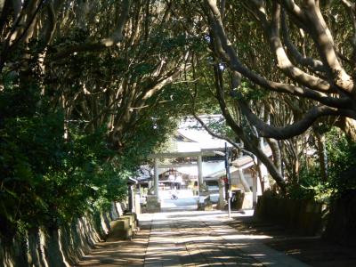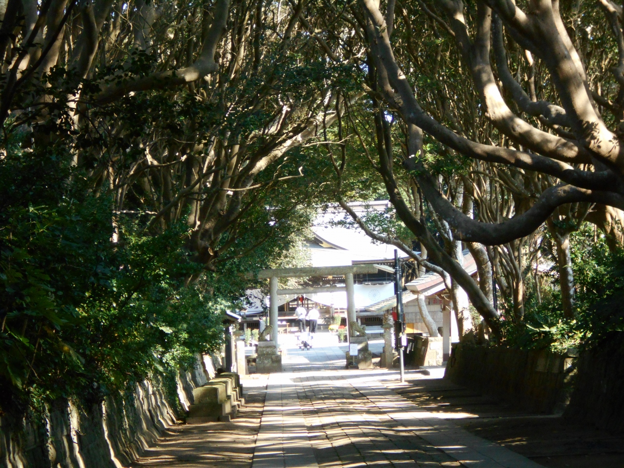 参道が素敵な神社です。つばきなどの広葉樹が参道の両脇に植わっていて、幹からのびた枝が参道をおおうようで、木漏れ日のほっこりする感じと神社の神聖な感じがミックスされて、おだやかな気持ちになれる空間を作り出しています。