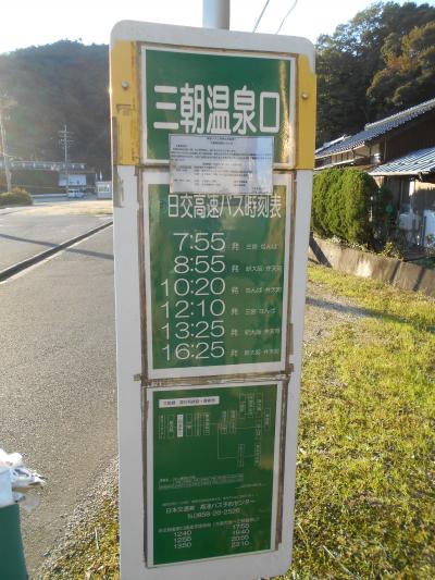 もうひとつ問題なのがこの三朝温泉口というバス停、三朝の温泉街から離れていて、歩くと40分程かかるのです。そこで温泉街から三朝温泉口のバス停最寄りの三朝町役場前までのバスを調べると16:24着とある。しかも役場前と三朝温泉口は微妙に数十メートル離れている。温泉街からのバスは日の丸交通という別の会社。どちらかのバスがちょっとでもずれたら終わりである。安全策で一本前のバスに乗ると、高速バスを30分も待たなければならない。温泉街から役場前までバスに乗っても歩いても、温泉街を出るのは同じ時刻。ウーン…悩む。なんなんだ、この接続は。両社で調整できんのかいと腹が立つ。
