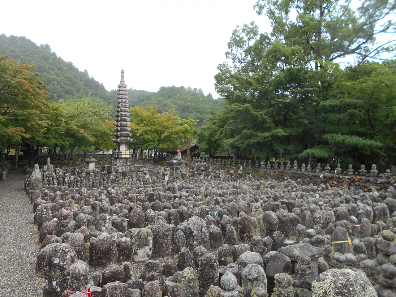 水子供養で有名な化野念仏寺。ご本尊は鎌倉時代の仏師湛慶の作だそうですが、それよりも無数の無縁仏が印象に残ります。小さな仏像の多くは苔むし、風にさらされてそのお顔や体形はわからなくなっています。このあたりはかつて風葬が行われていたということなので、故人を思い立てられた石仏にはそれぞれの思いがこめられていたはずです。