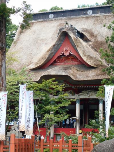 羽黒山、月山、湯殿山の三神を祀るので三神合祭殿といいます。羽黒山以外は冬場は登拝できないため、ここに合同で祀られているそうです。まず感じるのが屋根のぶ厚さ。茅葺きの萱の厚みがすごい。赤漆の本殿が萱に飲み込まれてしまうかのように感じました。流れるようなカットの仕方も独特で、立体感のある仕上がりになっています。