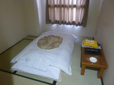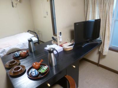 インターネットで予約した宿。実際に着いて外観を見ると建物が古そうで、正直しまったと思いました。建物の造りも古いタイプの旅館といった感じです。でも部屋はきれいに改装されていました。意外にも室内は洋室。狭いながらも荷物置きや机など工夫して配置されていました。