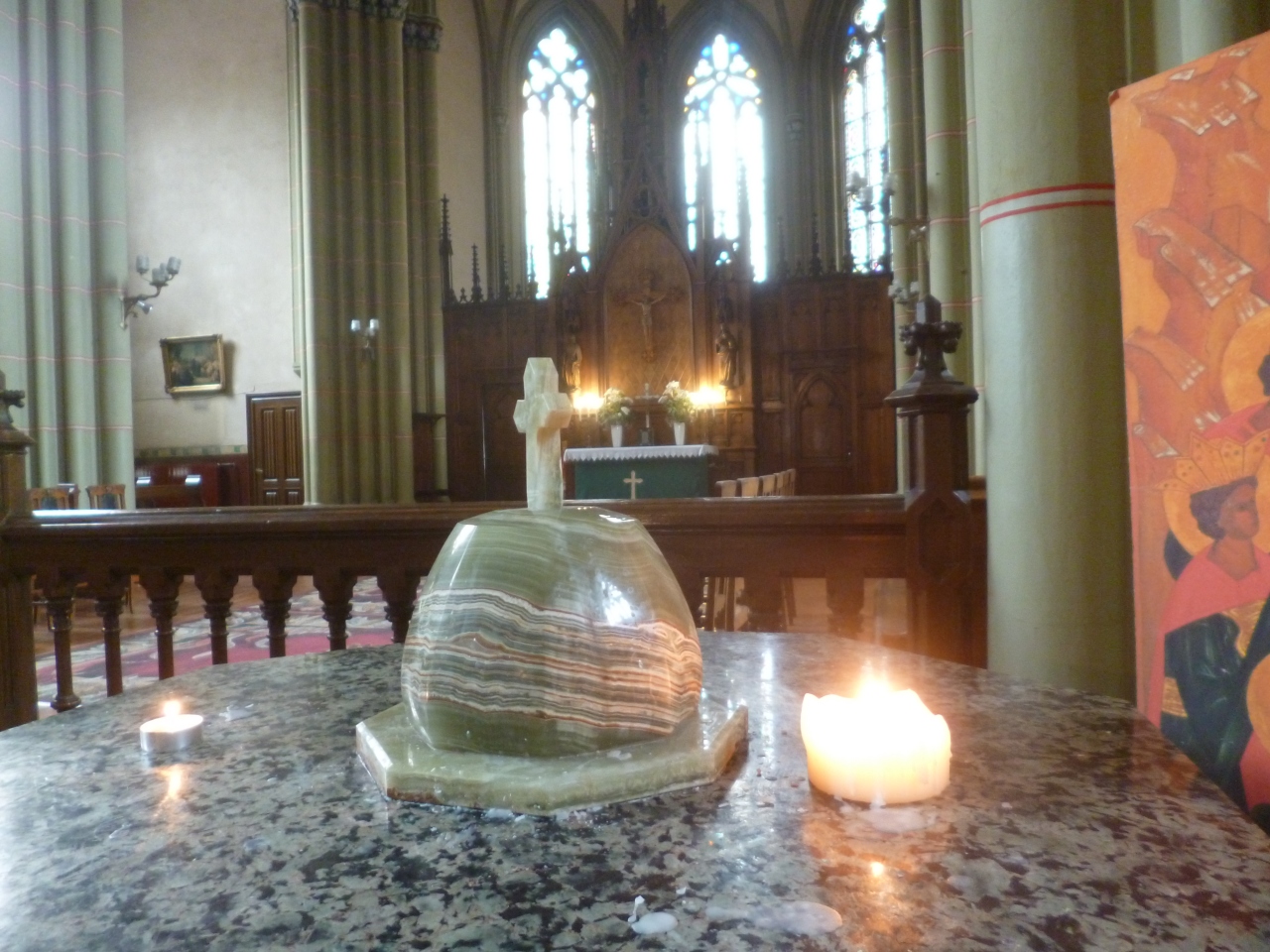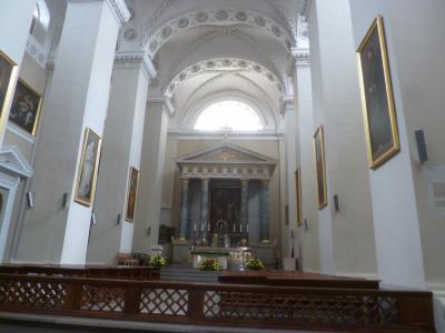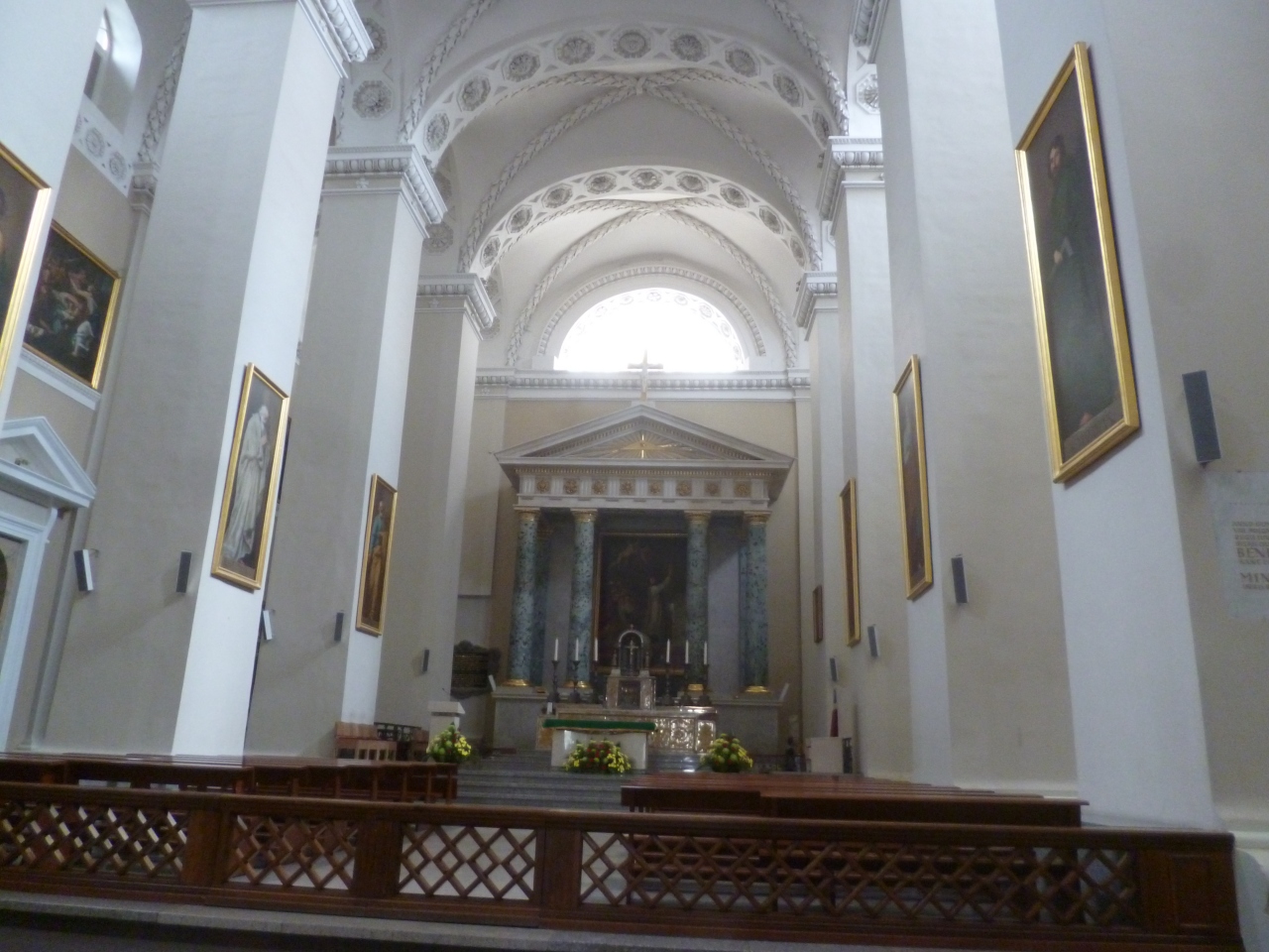 小国ながら首都の大聖堂だけあって、ギリシャ神殿風の正面にはレリーフが施されていて堂々たる構えです。ところが、中に入ってみるとあっさり。壁には装飾が少なくて絵画が中心。建物が新しいので漆喰の白がまぶしくて、なんだか学校の講堂にいるような感じでした。