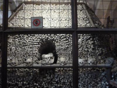 小さな納骨堂にぎっしり積まれた人骨。いったい何体分の人骨が納められているのか想像がつきません。人骨を使った貴族の紋章や塔のような飾りには、ただただ圧倒されるばかり。僕には悪趣味に見えましたけど。観光客が多いせいか妖気的な空気感はなく、まったくこわさを感じません。