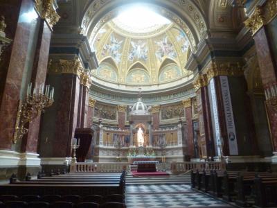 ハンガリーの英雄でありまたキリスト教を保護した王のの名前を冠した教会だけあって、とても大きく立派です。丸天井の下にはたくさんの席が設けられていて、数千人単位で座れそうに巨大です。建築時期が比較的新しいのか装飾類も劣化がなくきれいです。色調は茶色がメインで、金も使われていますがそれほど主張しておらず落ち着いた印象をうけます。