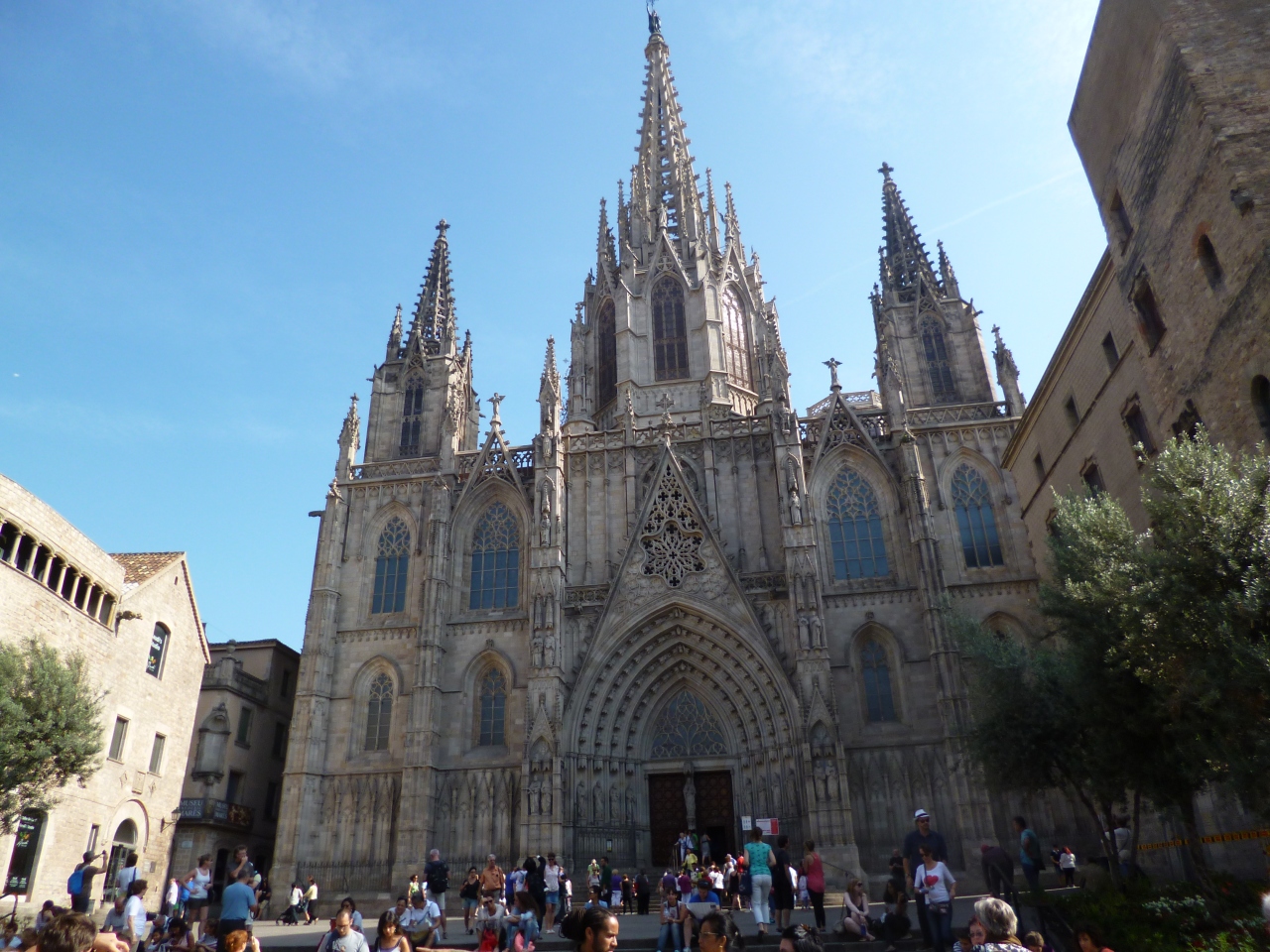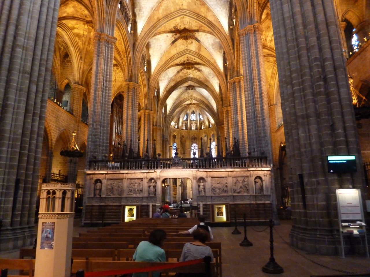 正面はゴシックの王道をいく姿、内部もどっしりとした、贅をつくしたものです。サイドチャペルのひとつひとつが立派ですし、主祭壇が半地下になっている構造も面白い。バルセロナは昔から栄えた町でしたから、これだけの教会が造れたのですね。