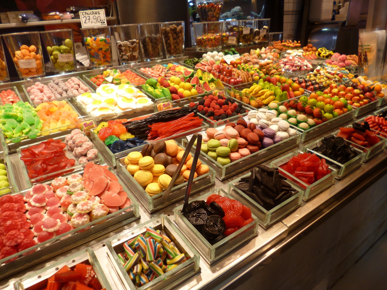野菜、果物、肉、菓子…。いろいろなものが売られています。野菜だけでも数十の店が並ぶので、それぞれが美しく商品を飾っていて、競い合っているかのよう。買うものがなくても、見て歩くだけで楽しい市場です。カウンター風のレストランもたくさんあり、おいしいと評判のようです。