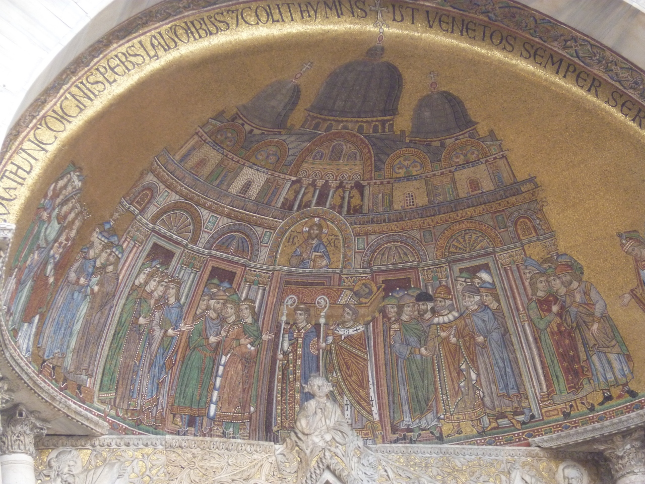 内部は金がふんだんに使われていて豪華。それでいて落ち着いて見えるのは、年月の経過と暗めの照明のせいでしょうか。壁や天井のモザイク画がていねいに描かれていて美しい。経済的に豊かだった町にはどこにもすばらしい教会がありますが、さすがヴェネツィアですね。もう少し人が少なければいいのですが。
