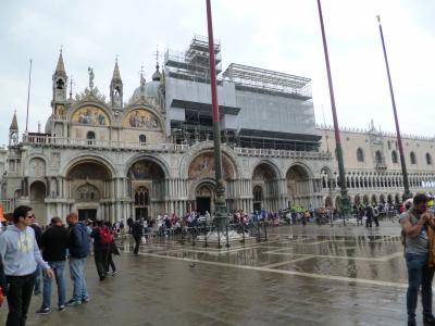 あいにく、修復工事の足場が邪魔でしたが、屋根の上に丸いクーポラがボコボコと乗っかっていて、ゴシック教会によくみられるような高い尖塔はない。その外観はサンマルコ広場によく似合っていると思います。