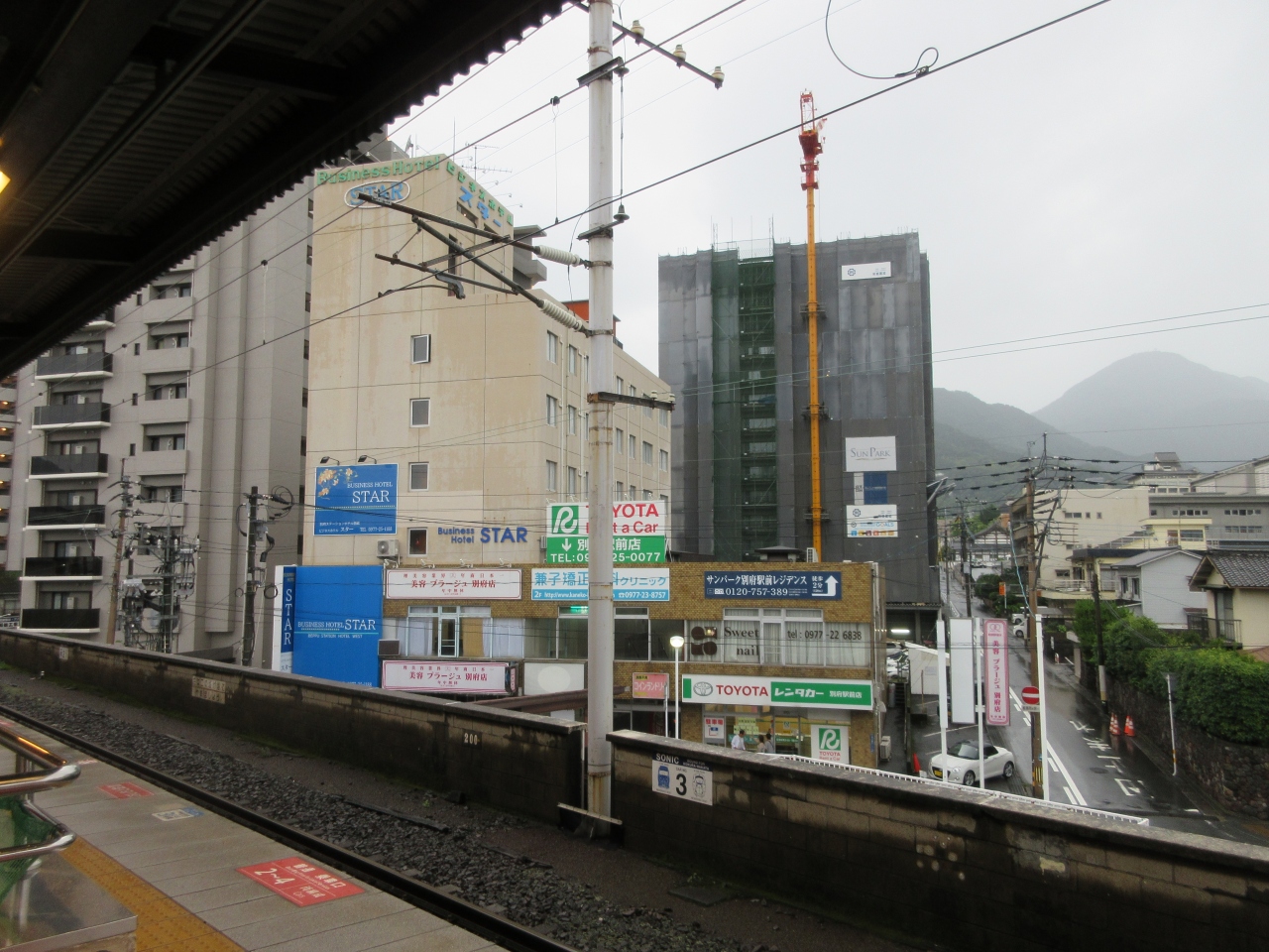 添付の写真は別府駅のホームから撮ったものですが、ライトブルーの看板があるところがホテルです。駅のすぐそばだというのがわかっていただけるかと。