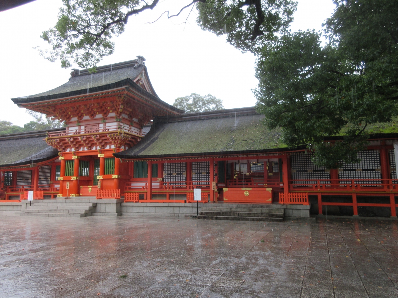 手水場の水盤は重さ24トン、日本一だそうです。手を清めてから伊勢神宮にならい外宮から内宮の順に参拝したのですが、どうも内宮からが順路だったようです。ゆっくり境内を歩きたいところですが、あいにく線状降水帯が九州地方にかかった日で、激しい雨、少し歩いただけで靴がズゴズゴになってしまいました。すべての音が雨音でかくれてしまうほどで、それはそれで雰囲気はありましたが、歩き回る気力が失せるほどの雨に困りました。