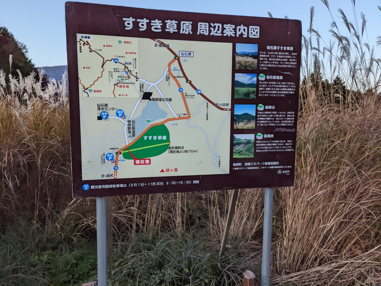 秋の仙石原、夕日に染まる所を見たかった。紅葉時期の週末、かなり混んでいた