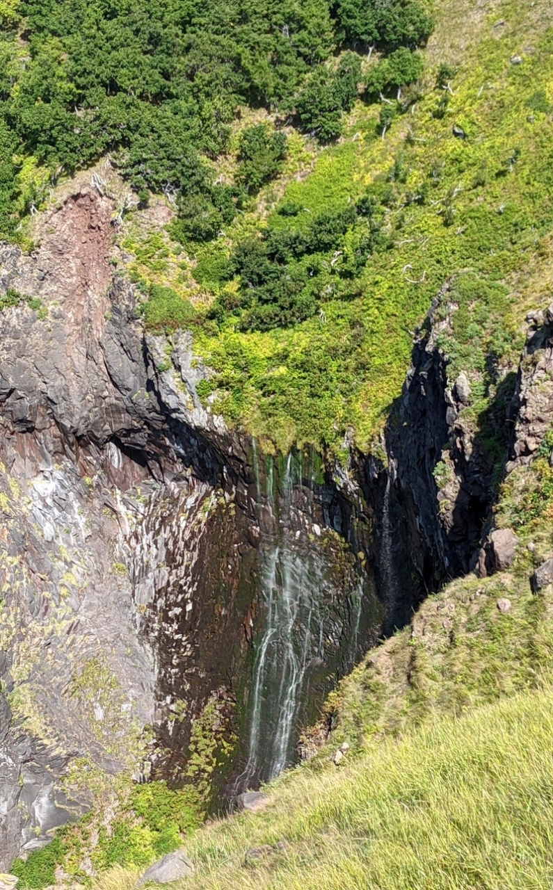 海沿いに展望台があり、100mの断崖から地下水が流れ出る、フレペの滝を