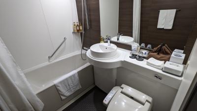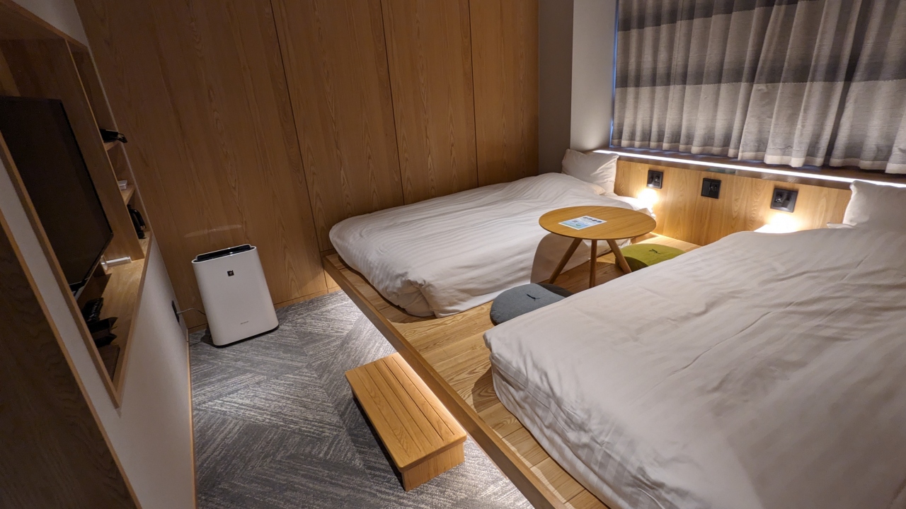部屋には冷蔵庫、空気清浄機あり、無料でペットボトルの水が人数分あり、フリーWi-Fi完備、枕元にコンセントあり。バスルームはユニットバスです