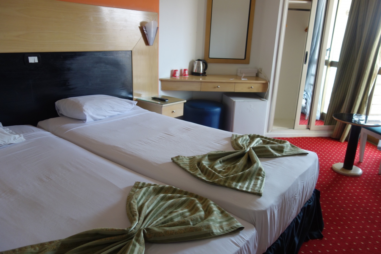 部屋は狭くて、ベッドでいっぱいな感じですが、ポットや冷蔵庫、スリッパやお水もあり、