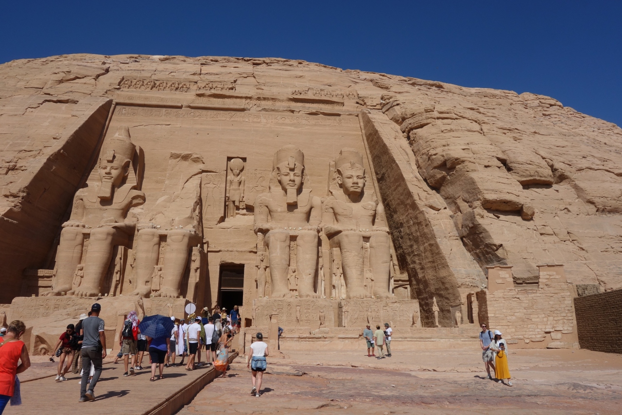 外観、岩を削った4体の高さ20mのラムセス2世像は