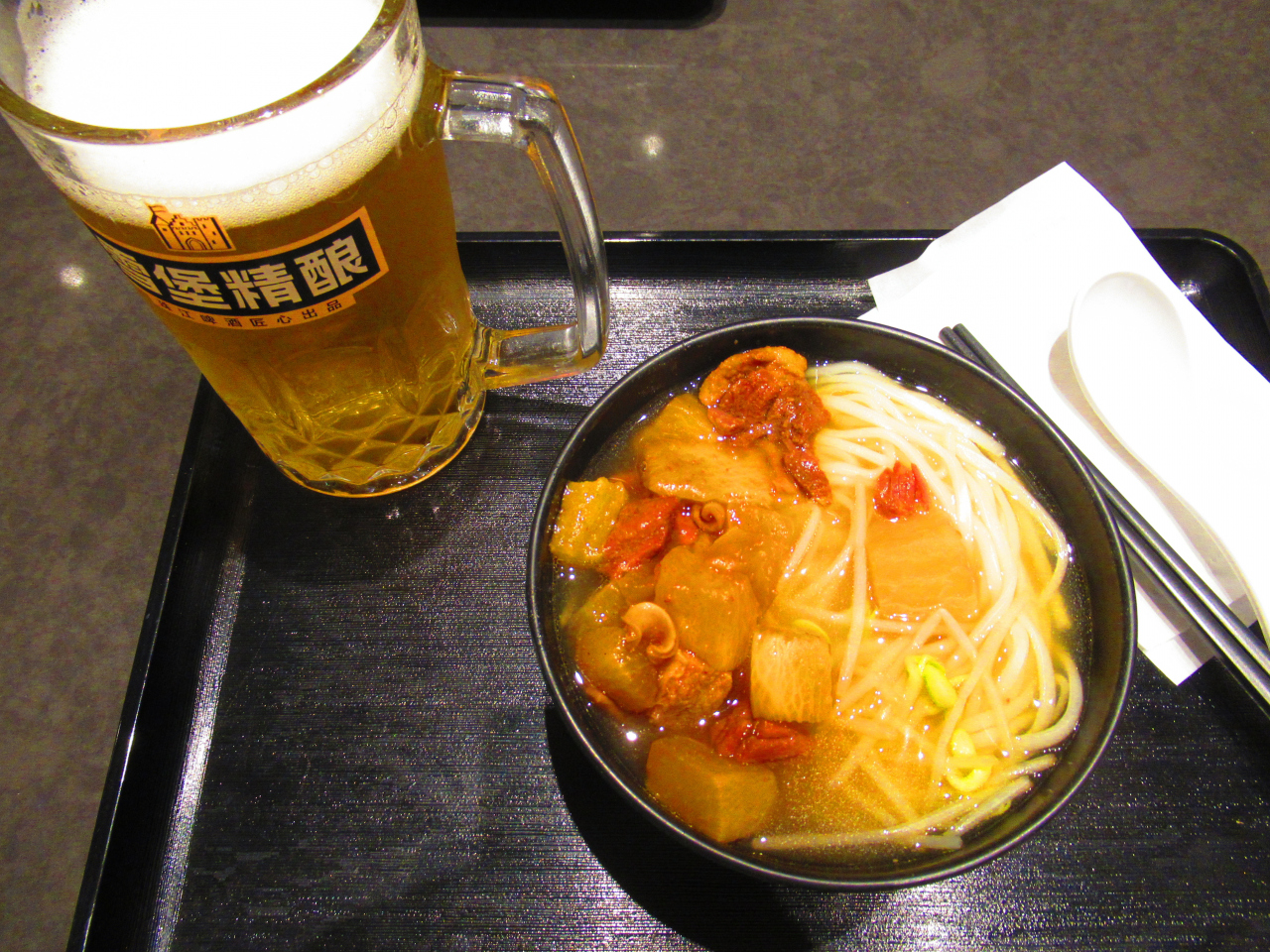 JALの利用だったので、第2ターミナルでした。3階の保安検査を通過してエスカレーターで上ったところにありました。ビールは缶と、その場で注いでくれる生ビールもありました。ヌードルバーがありいろいろ選べました。デザートもいろいろありました。