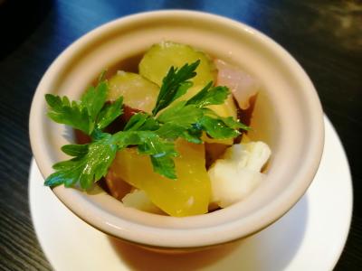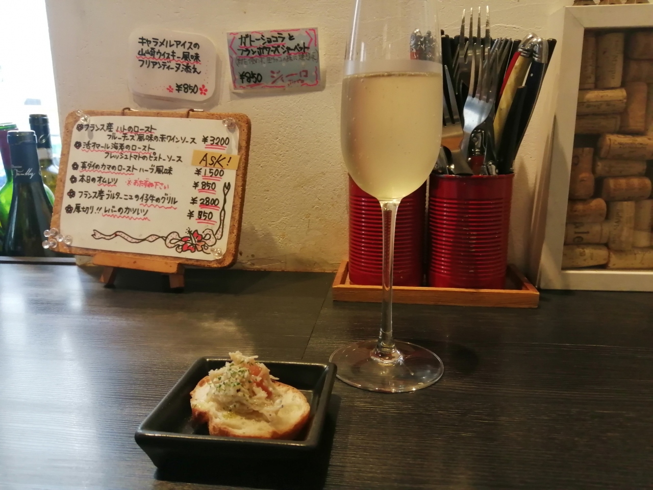 飲食店の多い野毛のちょっとはずれの方にあるビストロで、とても狭いお店です。案内されたカウンター席は、椅子とカウンターの高さが合っていないと感じました。