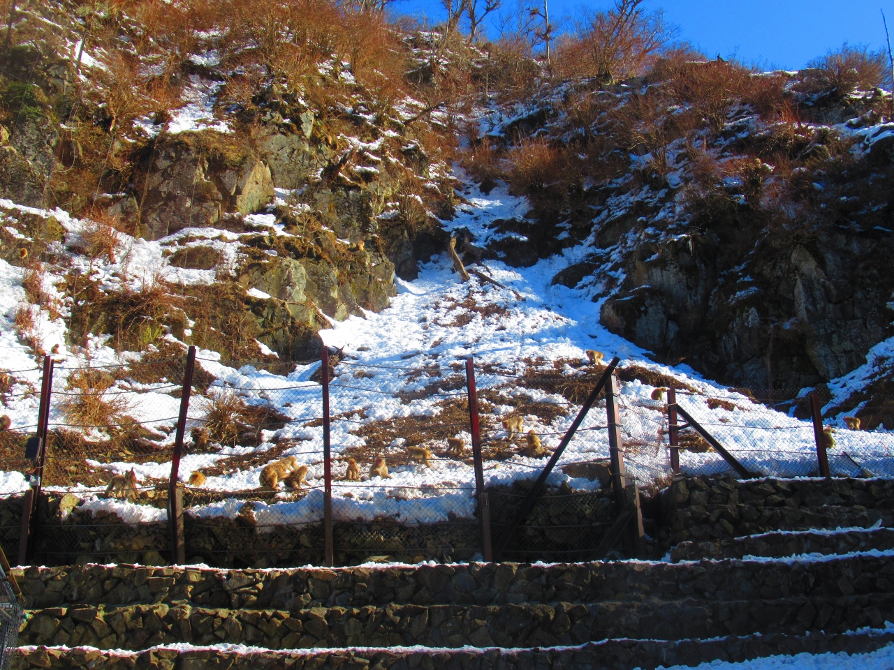 温泉に入る猿で有名で、バス停「スノーモンキーパーク」からだと徒歩で1時間弱かかります。バス停前の「クリスタルテラス」では、荷物預かりをしているようです。車だともう少し近くの駐車場まで行けますが、歩いてしか行けないです。冬場は凍結した山道を歩くので、それなりの準備が必要です。階段以外はほぼ平坦です。