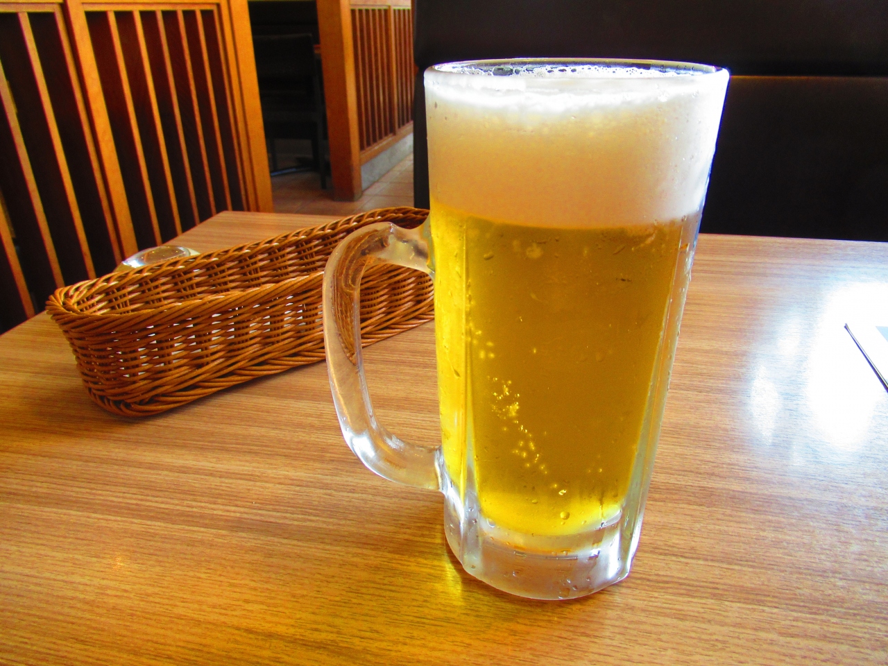 予約してた時間より早めに着いたのですが、空いていたので入れてもらえました。期間限定でビール大ジョッキが¥190だったので、暑かったし、普段頼まないのに頼んでしまいました。