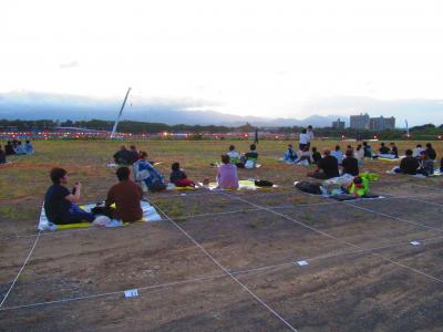 開始の15分前ぐらいに会場に着きましたが、場所取りをする必要がないので、全然問題なく、区画が決まっていて入口で渡されるシートを各自敷くという方式で、周囲との間隔はゆったりしていました。