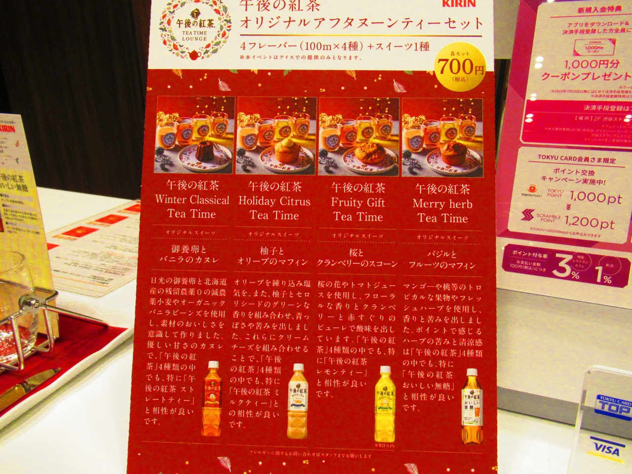 今回は12階イベントスペース Scene12で開催されていた「午後の紅茶 TEA TIME LOUNGE」というイベントに参加しました。市販されている午後の紅茶4種類と好きなスイーツ1種類がセットで¥700でした。スイーツは「御養卵とバニラのカヌレ」にしました。大きな窓からは渋谷の景色が見下ろせ、とても眺めがよかったです。立ち席だったので飲み終わったら出ましたが、椅子があったら長居したかも知れません。- 旅行時期