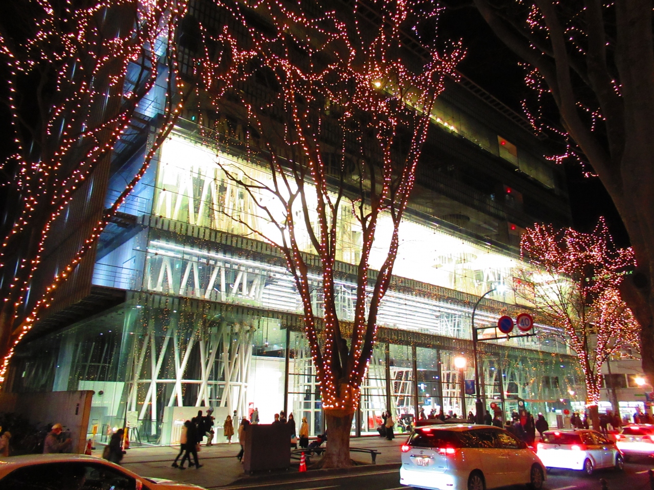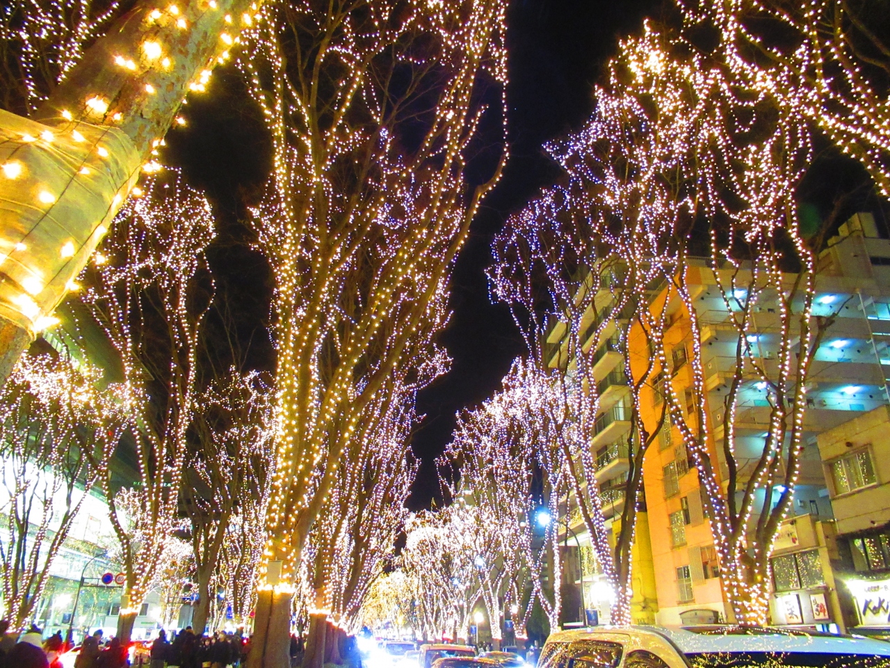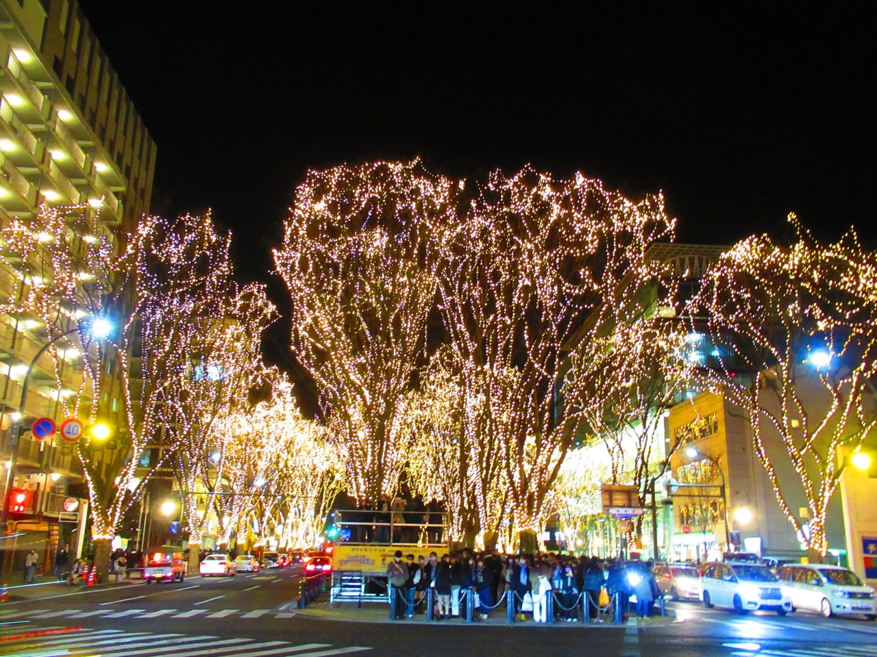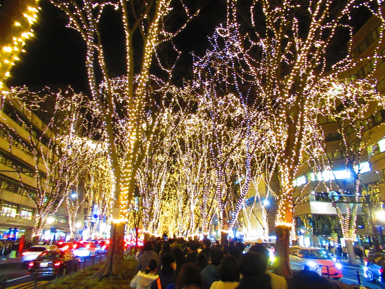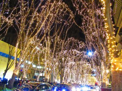 仙台の中心部、定禅寺通のケヤキ並木に電球が巻かれる王道のイルミネーションです。12月に3週間ほどの開催でした。その最終日に行きましたが、クリスマスだからかものすごく混んでいました。なお、付近を走るバスのルートが変更されたり休止されたりしますので要注意です。