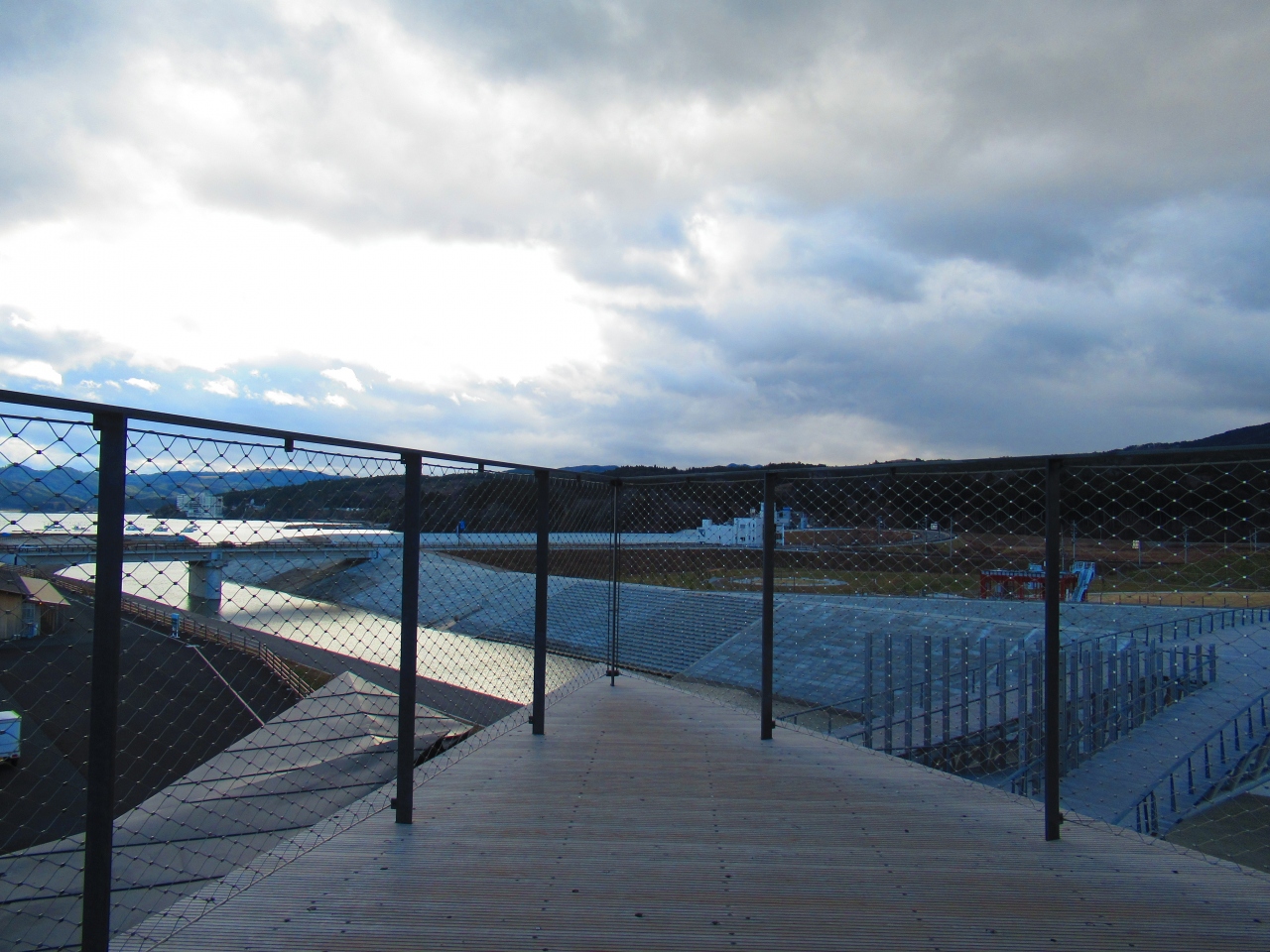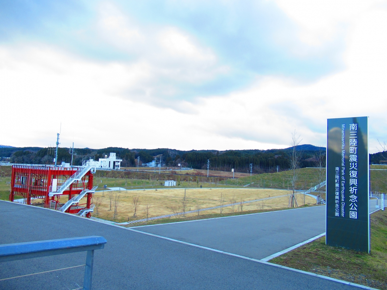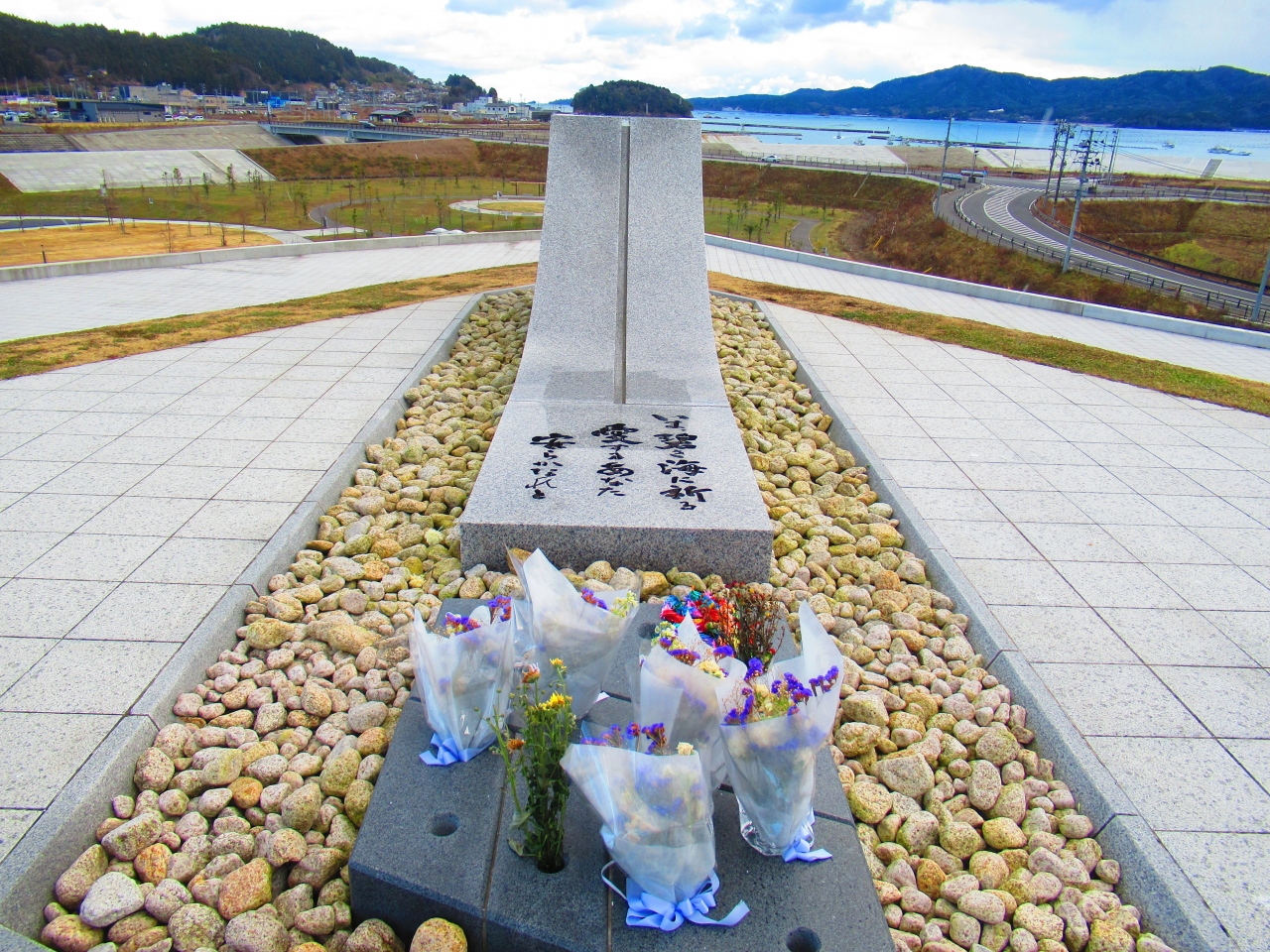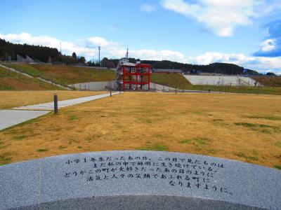 公園の一番高い、海が見える見晴らしのいい場所には震災で犠牲になった方々の名簿を納める「名簿安置の碑」があり、遠くには震災遺構「ブライダルパレス高野会館」が見えます。- 旅行時期